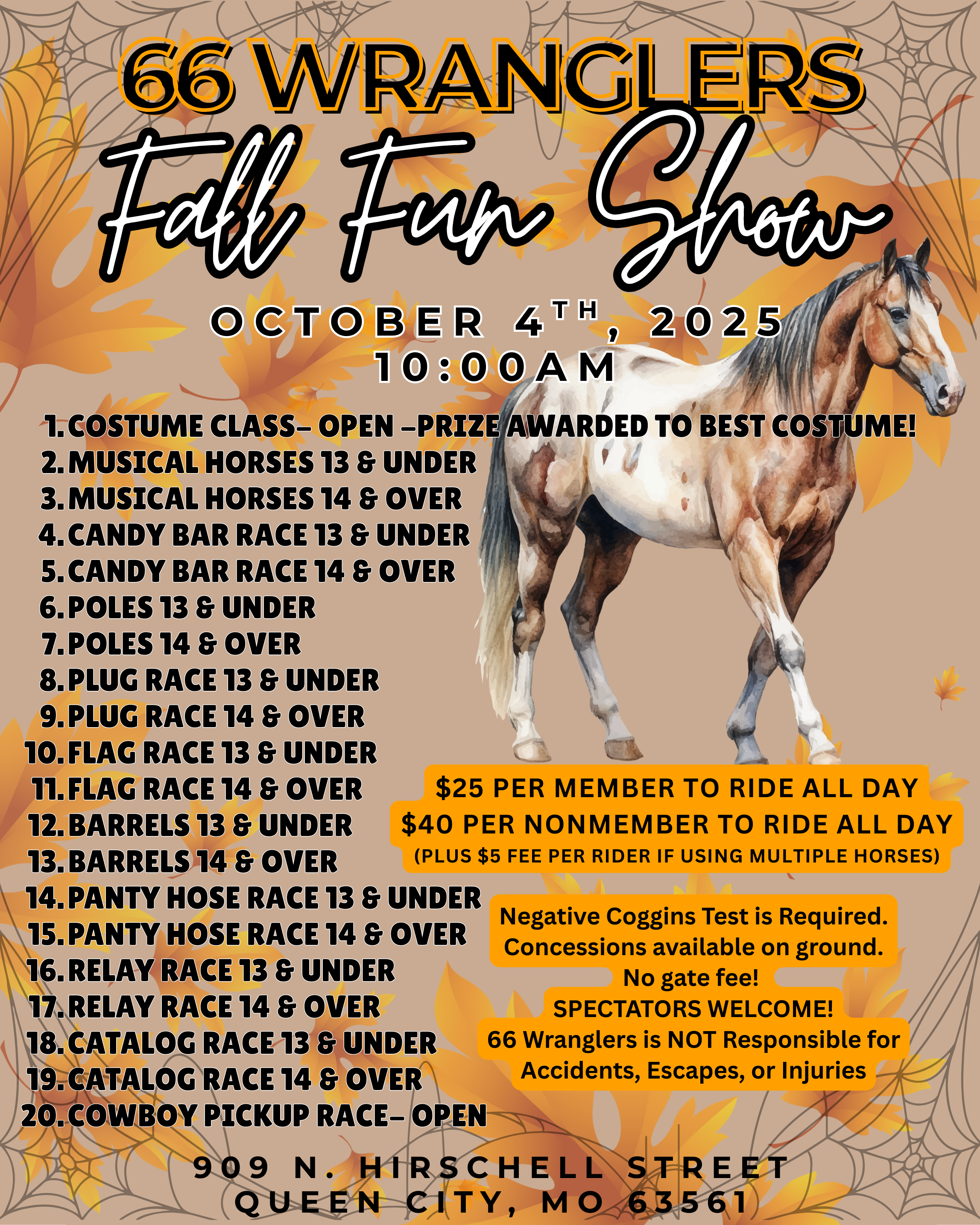 10:00 AM Fall Fun Show! Laid back fun atmosphere with speed classes!Prizes for the best costume!