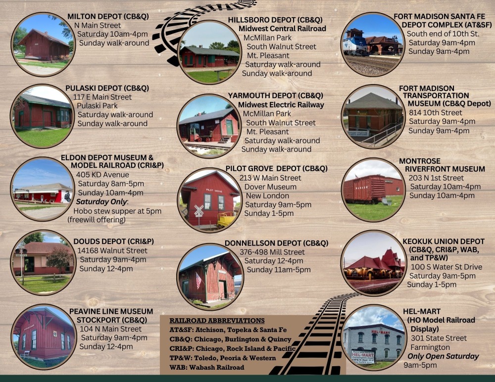 Embark on a journey through time and discover the rich history of our region's historical depots.Join us for the Southeast Iowa Depot Tour, where you can visit museums, railroad displays, and 14 lovingly preserved depots nestled in the scenic rolling hills of our region.Pilot Grove (CB&Q)Sat: 9 AM – 5 PM • Sun: 1 – 5 PMDover Museum, 213 W Main St, New London, IAEldon Depot Museum & Rocket Room Model Railroad (CRI&P)Sat: 8 AM – 5 PM • Sun: 10 AM – 4 PM405 KD Ave, Eldon, IAHobo Stew Supper – Saturday at 5 PM (Free Will Offering)Pulaski Depot (CB&Q)Sat & Sun: Walk-Around42 1st St, Pulaski, IADouds Depot (CRI&P)Sat: 9 AM – 4 PM • Sun: 12 – 4 PM14168 Walnut St, Douds, IAMilton Depot (CB&Q) – NEW SUNDAY TIMESat: 10 AM – 4 PM • Sun: 12 – 4 PMN Main St, Milton, IAPeavine Line Museum (CB&Q)Sat: 9 AM – 4 PM104 N Main St, Stockport, IAFort Madison Museum (AT&SF)Sat & Sun: 9 AM – 4 PMSouth end of 10th St, Fort Madison, IAFort Madison Railroad (CB&Q)Sat & Sun: 9 AM – 4 PMSouth end of 10th St, Fort Madison, IADonnellson (CB&Q)Sat: 12 – 4 PM • Sun: 11 AM – 5 PM376–498 Mill St, Donnellson, IAYarmouth (CB&Q) & Hillsboro (CB&Q)Sat & Sun: Walk-AroundLocated at Old Threshers, 405 E Thresher Rd, Mt Pleasant, IAKeokuk Union Depot (CB&Q, CRI&P, WAB, TP&W)Sat: 8 AM – 12 PM • Sun: 1 – 5 PM100 S Water St. Dr, Keokuk, IAPancake Days – Saturday morning (pancakes & sausage, free-will donation for depot restoration). No tours on Saturday.Montrose Riverfront MuseumSat & Sun: 10 AM – 4 PM203 N 1st, Montrose, IA (Museum Only)Exhibits include photos of the old depot, Wabash Woodside automobile car, an observation platform, and a 1911 blueprint of the Keokuk–Montrose rail line before the dam was built.Hel-Mart (HO Model Railroad Display)Sat: 9 AM – 5 PM301 State St, Farmington, IANEW! Centerville CB&Q DepotSat: 9 AM – 5 PM1124 S 18th St, Centerville, IAHosted by the Historic Preservation CorporationFeaturing: Albia & Northern Model Railroad’s large working model train, exhibits on Appanoose County’s rail history, and a guided Caboose Tour to explore traditional rail tools of the past.Railroad Abbreviations:CB&Q = Chicago, Burlington & QuincyCRI&P = Chicago, Rock Island & PacificAT&SF = Atchison, Topeka & Santa FeWAB = WabashTP&W = Toledo, Peoria & Western