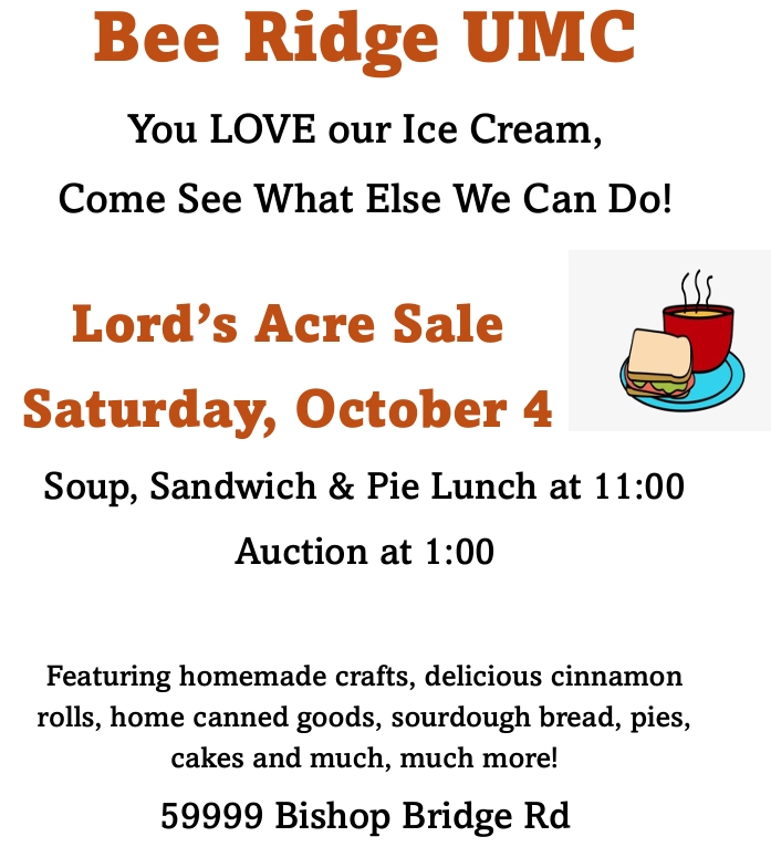 Bee Ridge UMC Lord's Acre Sale & LunchSoup, Sandwich & Pie Lunch begins at 11:00Auction begins at 1:00 featuring homemade crafts, food & more!